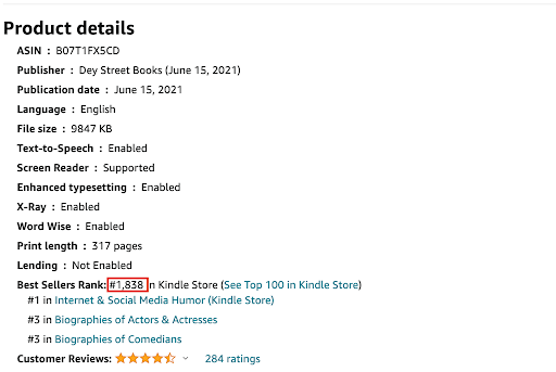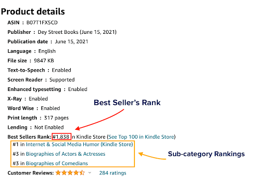 To find a book’s Best Sellers Rank, open the Amazon sales page of any book, and scroll down to the “Product Details” section. There you will see the Best Sellers Rank number.